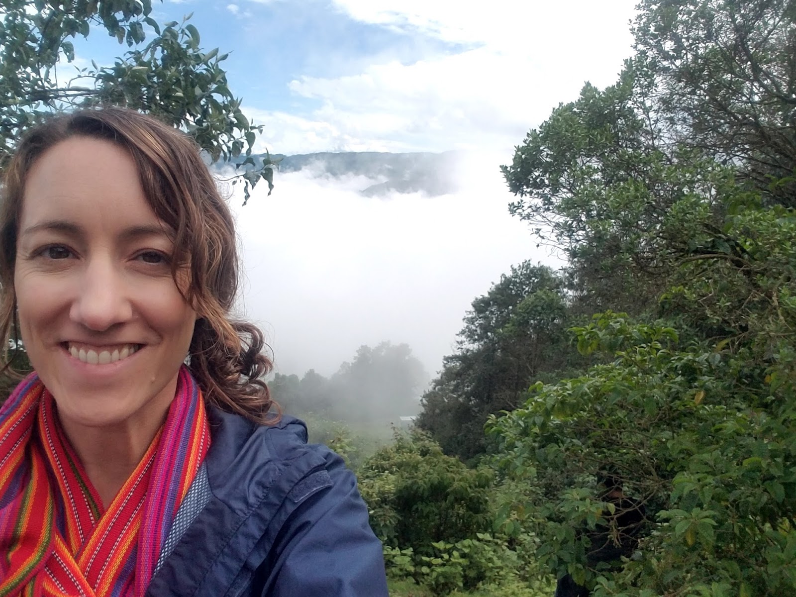 Katy following the guide through the mountains. Katy listening intently as he explains something. Katy looking at coffee plants with Basilio. Katy getting a weaving lesson from Basilio's mom (!).